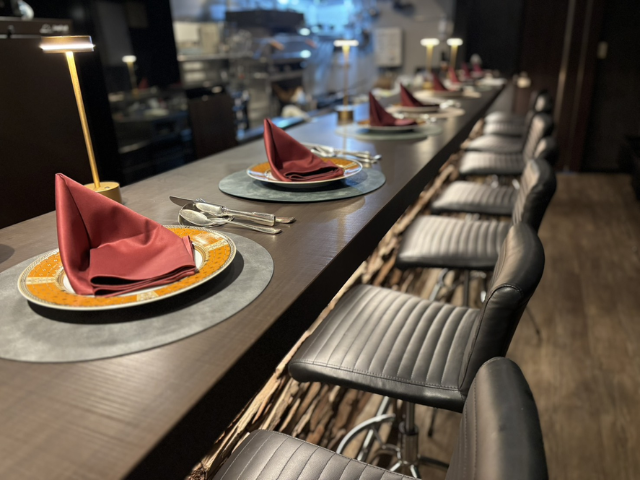 カウンター8席のみのシンプルで落ち着いた空間で、フレンチ歴15年のシェフが手がける季節の創作アミューズと、世界中から集めたファインワインをお楽しみいただけます。