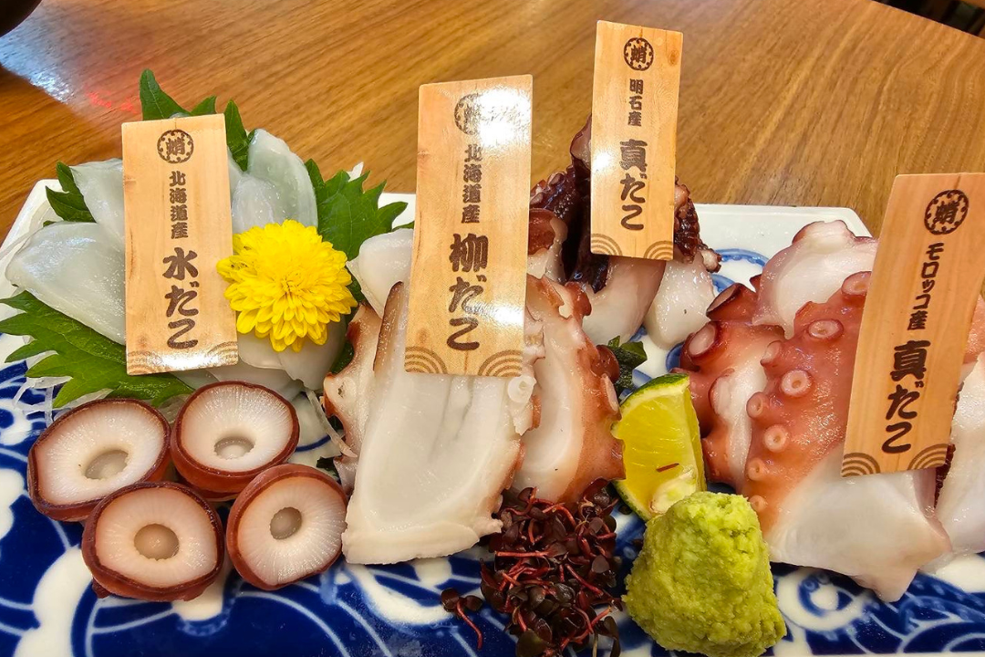 兵庫県明石市といえば“明石だこ”が有名ですが、当店ではそのぷりぷり食感が魅力の明石だこをはじめ、全国各地から仕入れた新鮮なたこを贅沢に味わえる「蛸刺身の食べ比べ」が人気です。産地によって異なる風味や食感を楽しみながら、自分好みのたこを見つけていただけます。なかでも、弾力と旨みを存分に堪能できる「明石だこの姿造り」は、多くのお客様がリピートする自慢の一品です。明石だこや蛸料理をお探しの方は、ぜひ当店で“本物のたこの旨さ”をご体感ください。鮮度抜群のたこ料理を通して、明石ならではの味覚をお届けします。