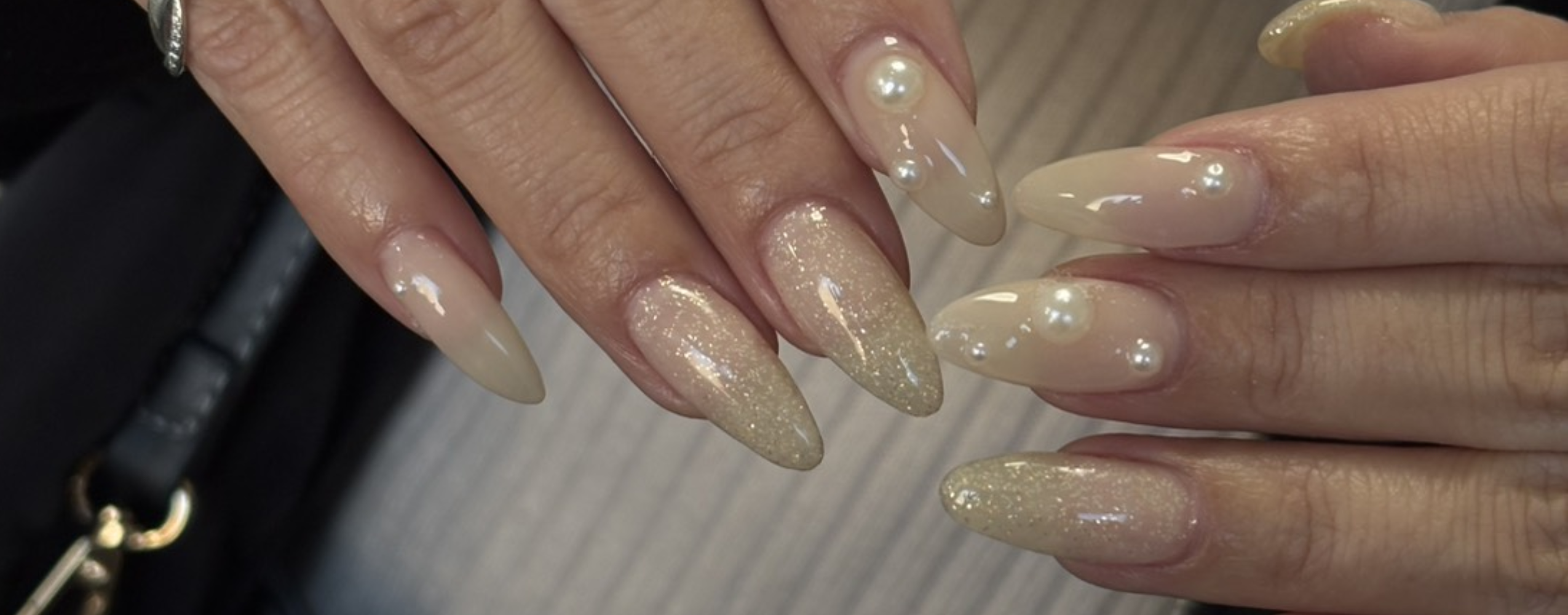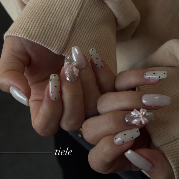 tieleで特に人気なのが、上品な仕上がりのシンプルネイルデザインです。オフィスでも馴染みやすいナチュラルカラーから、さりげないキラキラ感を楽しめるデザインまで幅広くご用意しています。爪の形や手元の雰囲気に合わせてデザインをご提案するため、指先がきれいに見える美爪ネイルを楽しみたい方にもおすすめです。