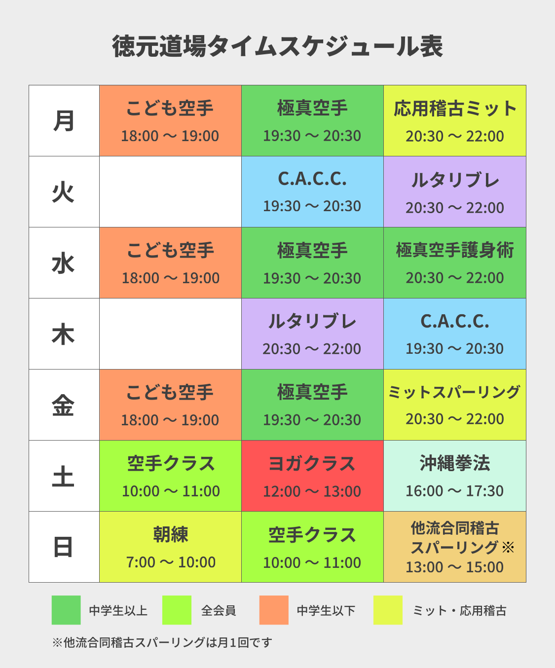 徳元道場では、小学生までを「子どもの部」、中学生以上を「大人の部」に分け、年齢や成長に応じた指導を行っています。初心者も安心して始められるよう、無理なく空手の基本や技術を学べるカリキュラムを整えています。各クラスで適切な指導を行うことで、心身の成長をサポートし、楽しく続けられる環境づくりに努めています。